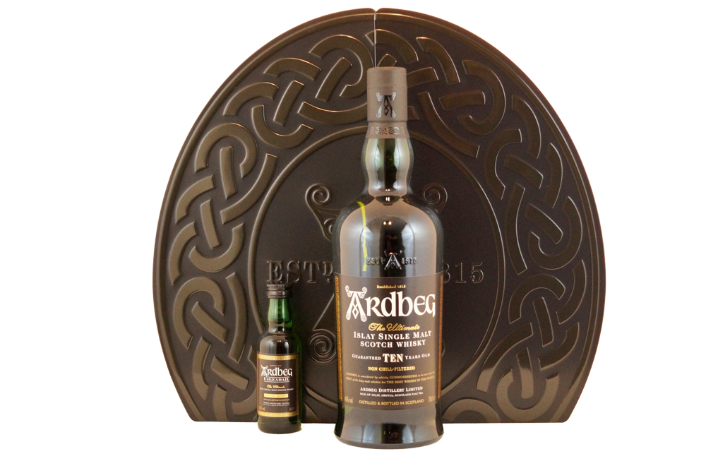 Ardbeg TEN Quadrant, der Klassiker aus der Ardbeg Destillerie in einer schönen Geschenkpackung mit Uigeadail Miniatur